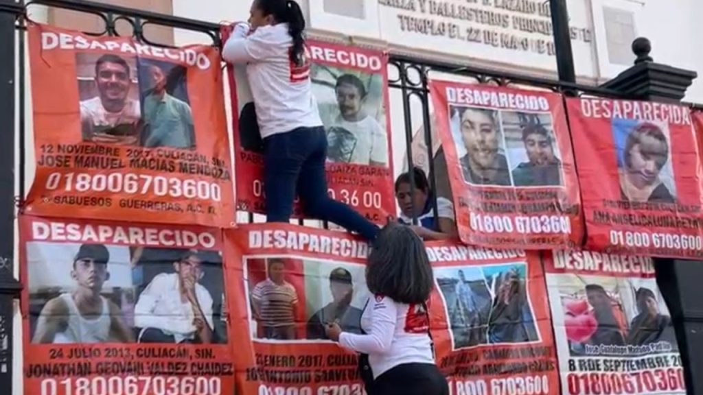 De forma simultánea, madres buscadoras toman poco a poco las escalinatas de la Catedral de Culiacán. Es una protesta más por los cientos de desaparecidos en esta guerra entre Chapitos y Mayos que ha cumplido ya un año el 9 de septiembre. Según datos de colectivos la cifra se acerca a los 3 mil casos, misma que contrasta con la cifra oficial que apenas se acerca a los mil 500.?
