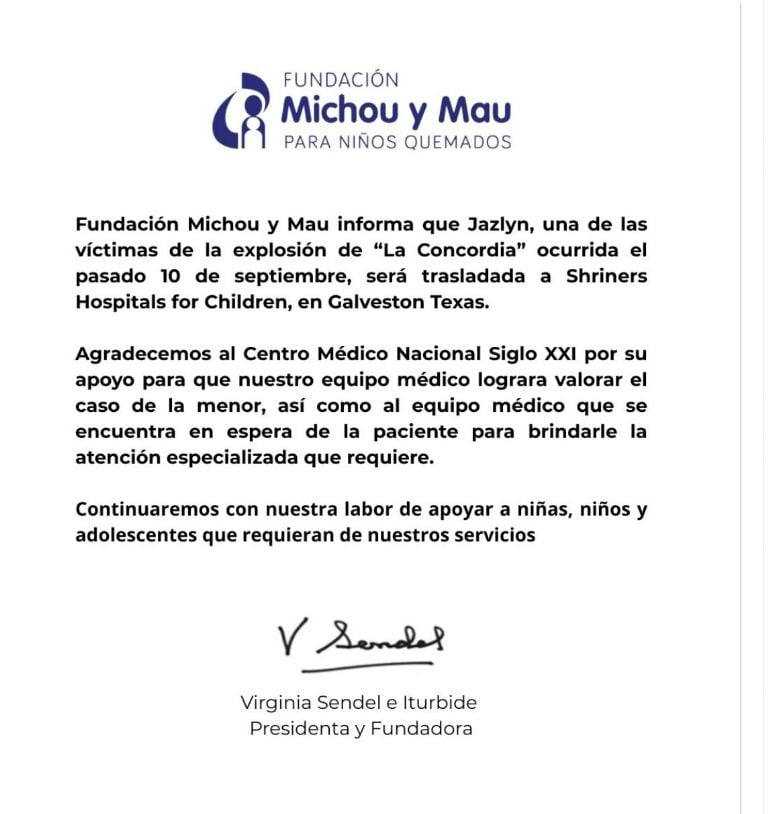 CIUDAD DE MÉXICO (apro).- Jazlyn Azulet Carrillo Matías, nieta de Alicia Matías Teodoro, quien la protegió con su propio cuerpo de la explosión de la pipa de gas LP el pasado miércoles 10 en Iztapalapa, fue trasladada al Shriners Hospital of Children, en Galveston, Texas, Estados Unidos, por parte de la Fundación Michou y Mau.