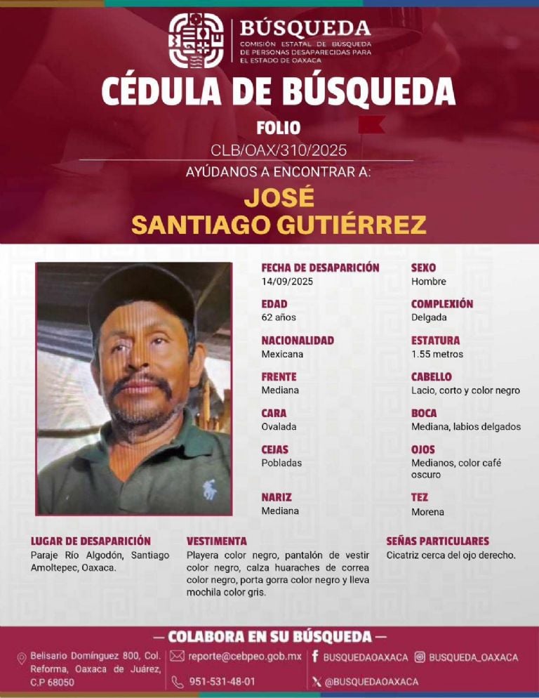 Y es que la fiscalía tuvo conocimiento de que José Santiago Gutiérrez fue visto por última vez el 14 de septiembre de 2025 en el paraje denominado “Río Algodón”, perteneciente a Santiago Amoltepec.