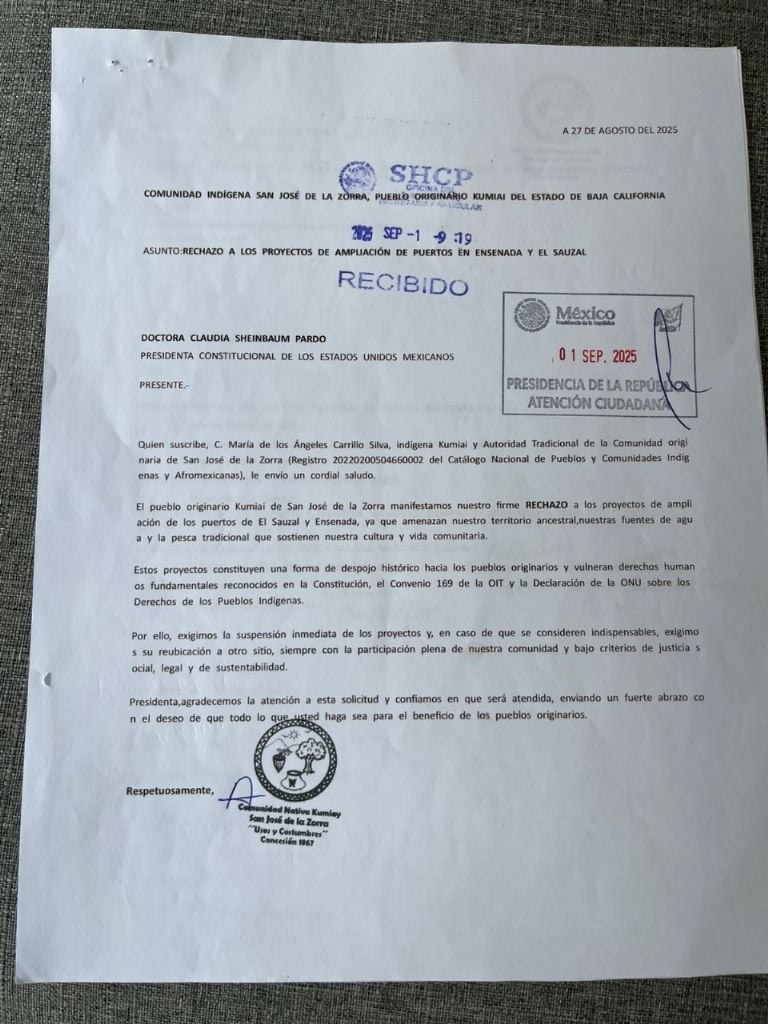 El documento, con el sello de esta comunidad y suscrito por la autoridad tradicional e indígena kumiai, María de los Ángeles Carrillo Silva, fue entregado al área de Atención Ciudadana de la Presidencia de la República, además de contar con el sello de recibido de la Secretaría de Hacienda y Crédito Público (SHCP).