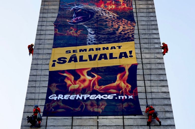 CIUDAD DE MÉXICO (apro).- “La Selva Maya grita, SEMARNAT (Secretaría de Medio Ambiente y Recursos Naturales) ¡SÁLVALA!”, es la frase que se puede leer en la pancarta que colocaron activistas de Greenpeace, la madrugada de este martes 23 de septiembre, en la Estela de Luz.