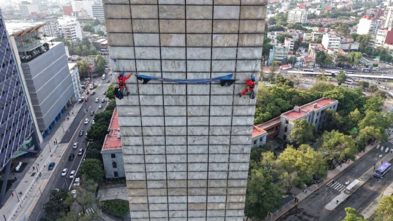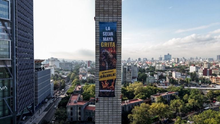 Como parte de una protesta contra la deforestación de la Selva Maya, en el sureste de México, integrantes de la organización se presentaron a las 5:00 horas en la Estela de Luz y escalaron alrededor de 70 metros en la estructura, que mide 104 metros de altura, para colocar la pancarta.