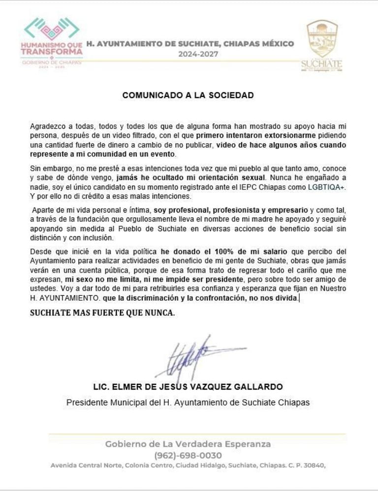 TUXTLA GUTIÉRREZ, Chis., (apro) .- Elmer Vázquez Gallardo, alcalde del municipio de Suchiate, Chiapas, y miembro visible de la comunidad LGBTIQ+, denunció públicamente haber sido víctima de un intento de extorsión, relacionado con un video donde aparece vestido con prendas femeninas, que fue difundido recientemente a través de redes sociales.