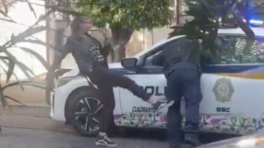 Según el relato de la SSC, el policía agredido intervino para calmar a la mujer, pero ésta reaccionó con mayor agresividad y, en un momento en que el uniformado solicitaba apoyo por radio, lo pateó.