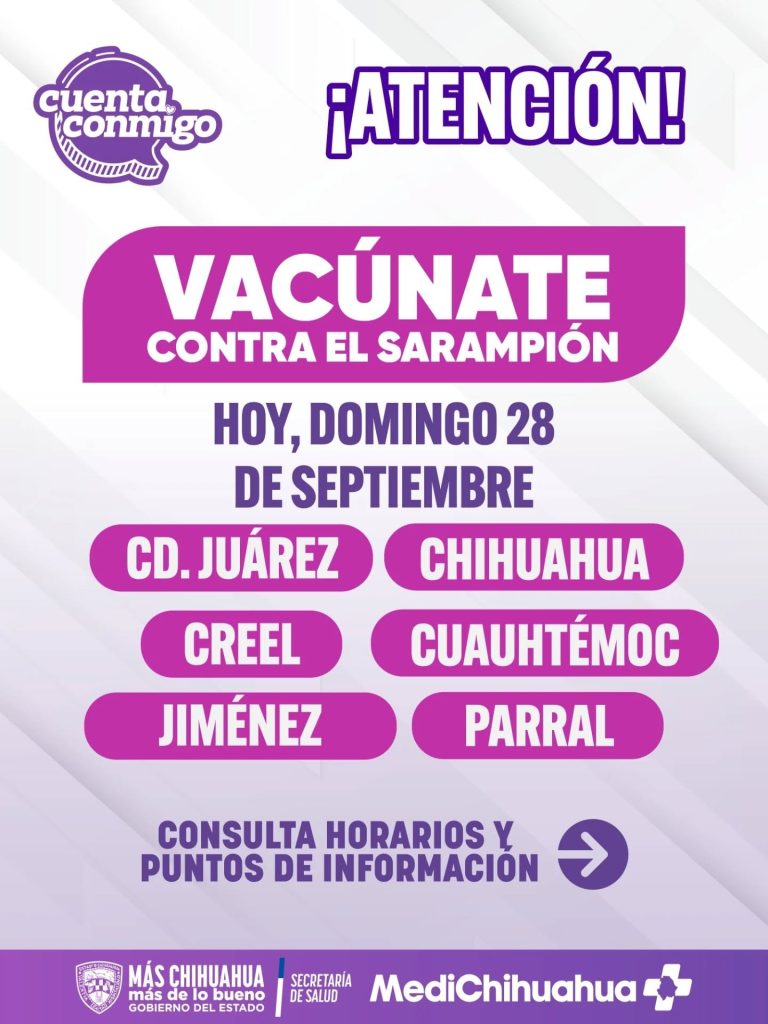H. Cd. de Chihuahua.- Este domingo 28 de septiembre se llevará a cabo una jornada especial de vacunación contra el sarampión en los municipios de Ciudad Juárez, Chihuahua capital, Creel, Cuauhtémoc, Jiménez y Parral. Autoridades de salud invitan a la población a acudir a su punto más cercano y revisar los horarios disponibles en cada localidad.