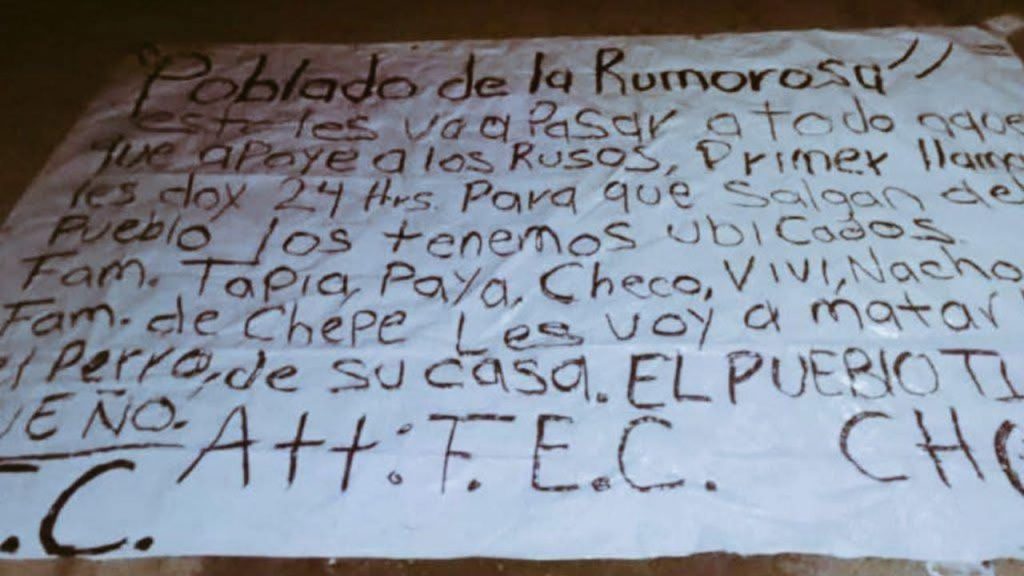 “Pobladores de La Rumorosa: esto les va a pasar a todo aquel que apoye a Los Rusos. Primer llamado: les doy 24 Hrs. para que se salgan del pueblo. Los tenemos ubicados fam. Tapia, Paya, Checo, Vivi, Nacho. Fam de Chepe les voy a matar el perro de su casa. El pueblo tiene dueño. Atte. F.E.C.”, de acuerdo con el texto divulgado.