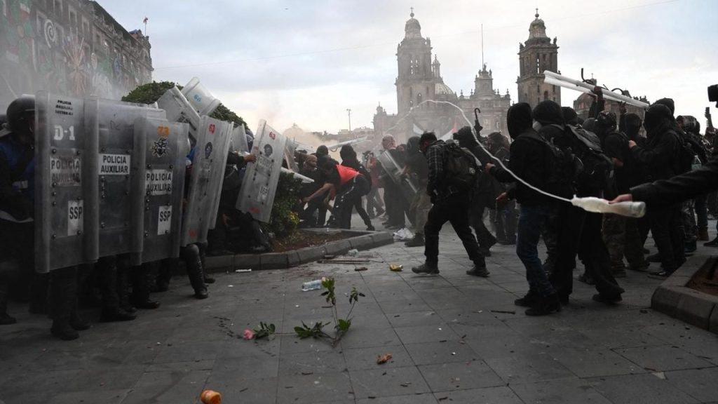 Hubo fogatas alimentadas con escudos arrebatados a policías, saqueos en tiendas de conveniencia y pintas contra el Gobierno Federal y contra la presidenta de México, Claudia Sheinbaum.