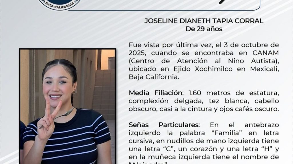 Conforme a los datos generales, Joseline fue vista por última vez cuando acudió al Centro de Atención al Niño Autista (Canam), ubicado en el Ejido Xochimilco de la capital bajacaliforniana.