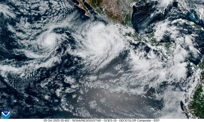 De acuerdo con el pronóstico para este domingo 05 de octubre, se esperan lluvias puntuales torrenciales de 150 a 250 mm y vientos de 50 a 60 km/h, con rachas de 70 a 90 km/h en las costas de Jalisco, Colima y Michoacán. Además, se prevé oleaje de 4.0 a 5.0 metros de altura en las mismas zonas.