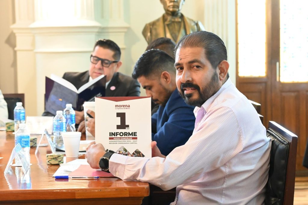 Chihuahua, Chih, 08 octubre 2025. El regidor de morena Hugo Eduardo González Muñiz presentó su primer informe de labores de cabildo en la administración 2024-2027, en donde destacó su trabajo en las comisiones y la postura en defensa de los recursos públicos de la administración municipal, de igual forma su trabajo en la atención y organización en redes vecinales en colonias de la ciudad.