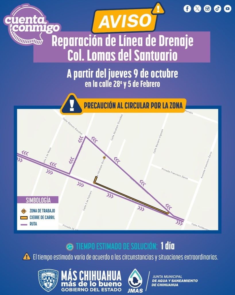 La Junta Municipal de Agua y Saneamiento (JMAS) de Chihuahua informó que, este jueves 9 de octubre llevará a cabo los trabajos de reparación de un tramo de línea de drenaje dañada en la calle 28ª y 5 de Febrero, en la colonia Lomas del Santuario.