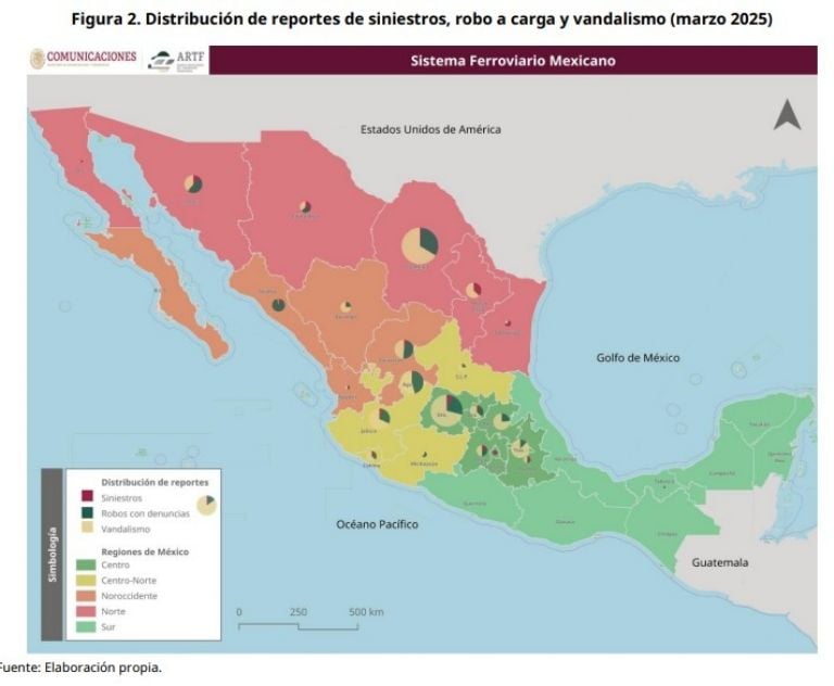 Los estados con el mayor número total de reportes son Coahuila, Guanajuato, Aguascalientes y Jalisco, mientras que en el rubro de estados fronterizos al norte del país, Coahuila, Nuevo León y Sonora presentan la mayor concentración de registros de la región, lo que se atribuye a la dinámica operativa del tráfico ferroviario internacional, “dado que estas entidades son puntos clave para el tránsito de mercancías entre México y Estados Unidos”.
