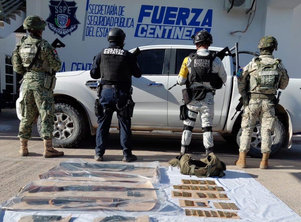 En un operativo conjunto realizado por la Guardia Nacional y el Ejército Mexicano, autoridades federales aseguraron cuatro rifles, dos armas cortas y más de 500 cartuchos útiles dentro de un vehículo con reporte de robo, durante patrullajes de seguridad en el municipio de Aldama, Chihuahua.