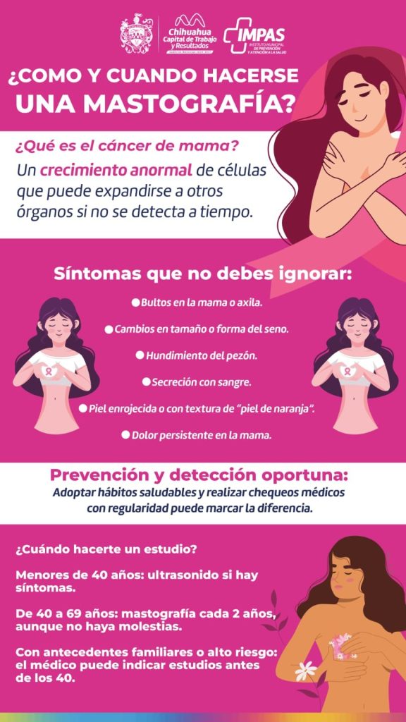 H. Ciudad de Chihuahua.-  Municipal de Prevención y Atención a la Salud (IMPAS), recuerda a la población la importancia de la detección oportuna del cáncer de mama, una enfermedad que puede afectar a mujeres de cualquier edad y que, si no se trata a tiempo, puede poner en riesgo la vida.