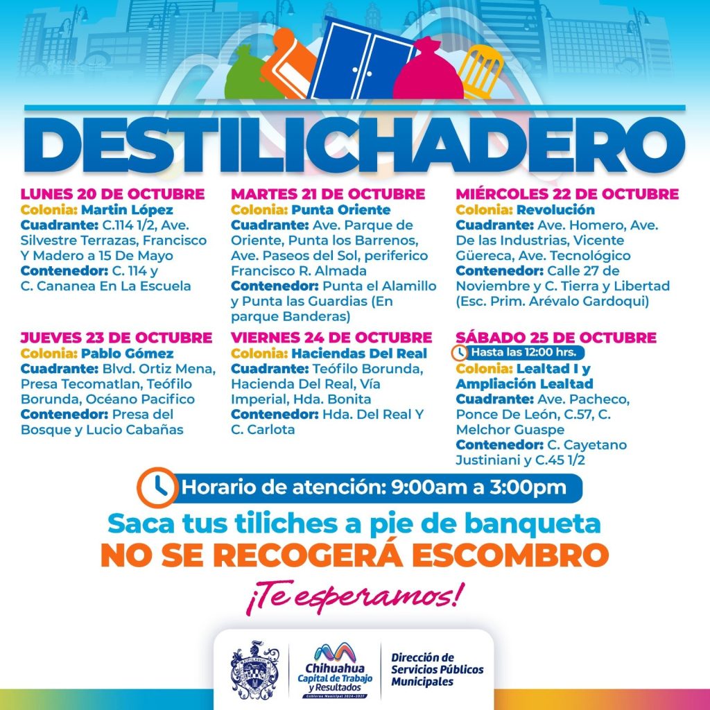 H. Ciudad de Chihuahua.- Para evitar acumulaciones de basura de grandes dimensiones en las viviendas, que podría generar plagas o problemas de salud, el Gobierno Municipal, a través de la Dirección de Servicios Públicos Municipales, informa el calendario del programa Destilichadero, que se realizará 20 al 25 de octubre en siete colonias de la Capital.