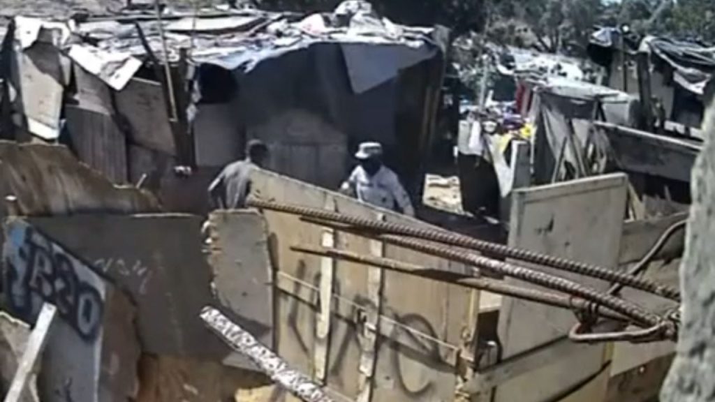 El presunto guardia es acompañado por otra persona, también de uniforme, gorra y chamarra negra, quien se mete a la vivienda elaborada con pedazos de cartón, lona y madera.