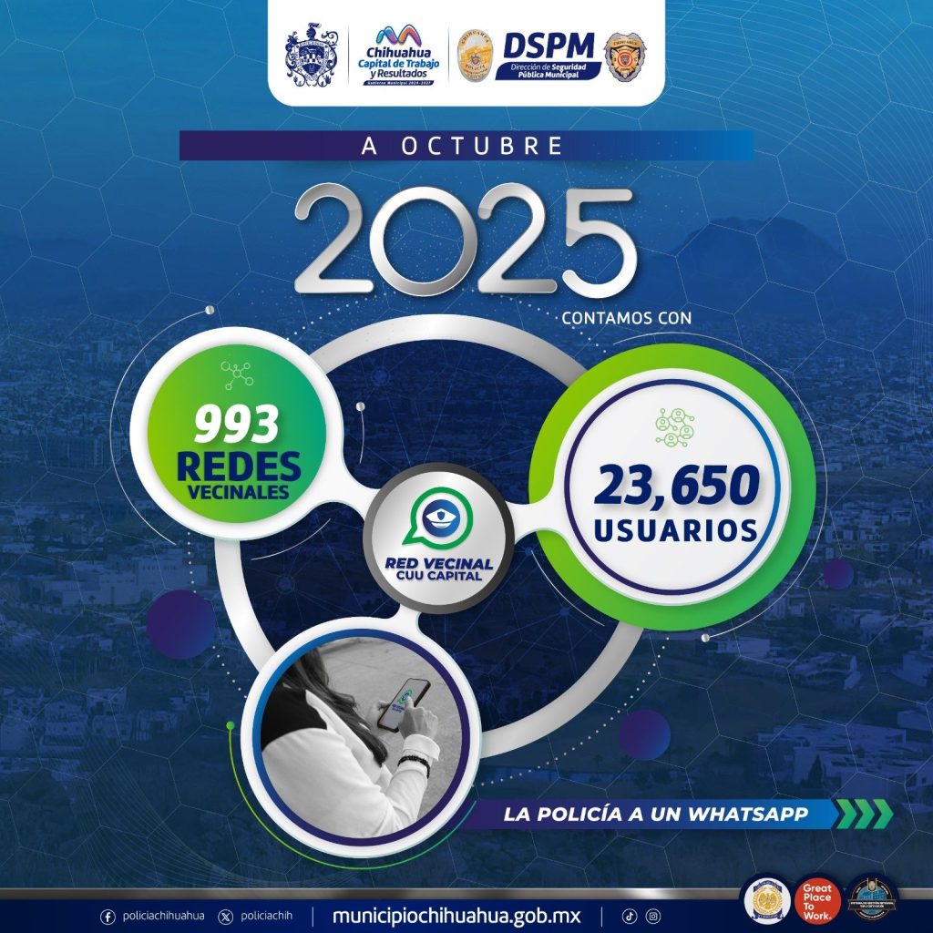 H. Ciudad Chihuahua, Chih., a 21 de octubre de 2025.– El programa Red Vecinal de la Dirección de Seguridad Pública Municipal (DSPM) continúa creciendo en la ciudad y al mes de octubre tiene 993 grupos activos y más de 23 mil 650 vecinos registrados que utilizan esta opción para mantener una comunicación rápida y directa con la Policía Municipal.