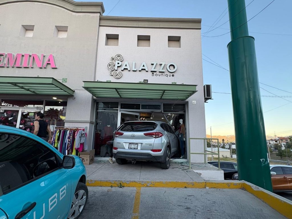 El percance se registró en el cruce de las calles Bahía de San Quintín y Universidad de Palermo, donde una camioneta Hyundai Tucson color gris terminó incrustada en el local comercial “Palazzo Boutique”.