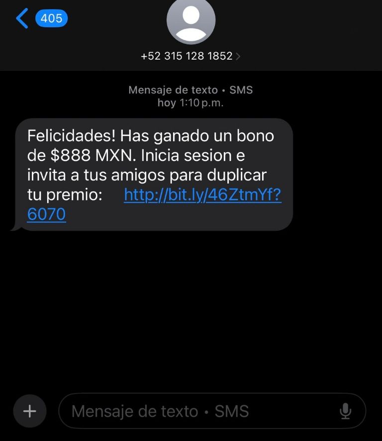 CIUDAD DE MÉXICO (apro).— En las últimas semanas se han multiplicado los mensajes de texto (SMS) que anuncian supuestos depósitos o bonos en efectivo y que invitan a tocar una liga acortada para “validar”, “liberar” o “duplicar” el dinero. Dos ejemplos recientes muestran el patrón: “Se han depositado 2,380 pesos en tu cuenta. Válido por 24 horas: [bit.ly/…]” y “Has ganado un bono de $888 MXN. Inicia sesión e invita a tus amigos para duplicar tu premio: [bit.ly/…]”. Se trata de smishing, una variante del phishing que busca robar credenciales bancarias o instalar software malicioso.