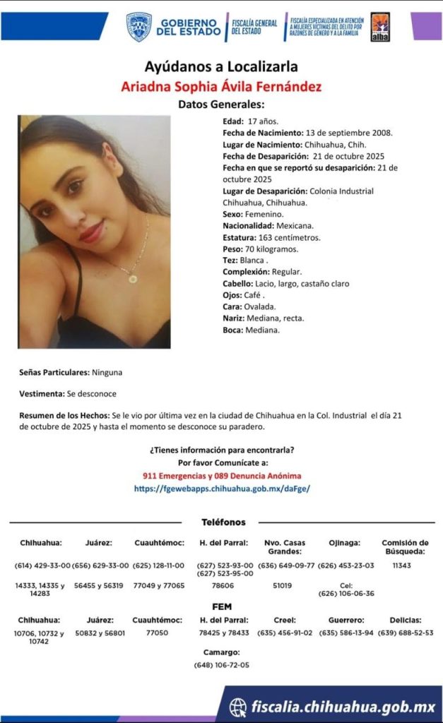 H. Cd. de Chihuahua.– La Fiscalía General del Estado emitió una pesquisa para localizar a Ariadna Sophia Ávila Fernández, de 17 años, quien fue vista por última vez el 21 de octubre en la colonia Industrial, en la ciudad de Chihuahua.