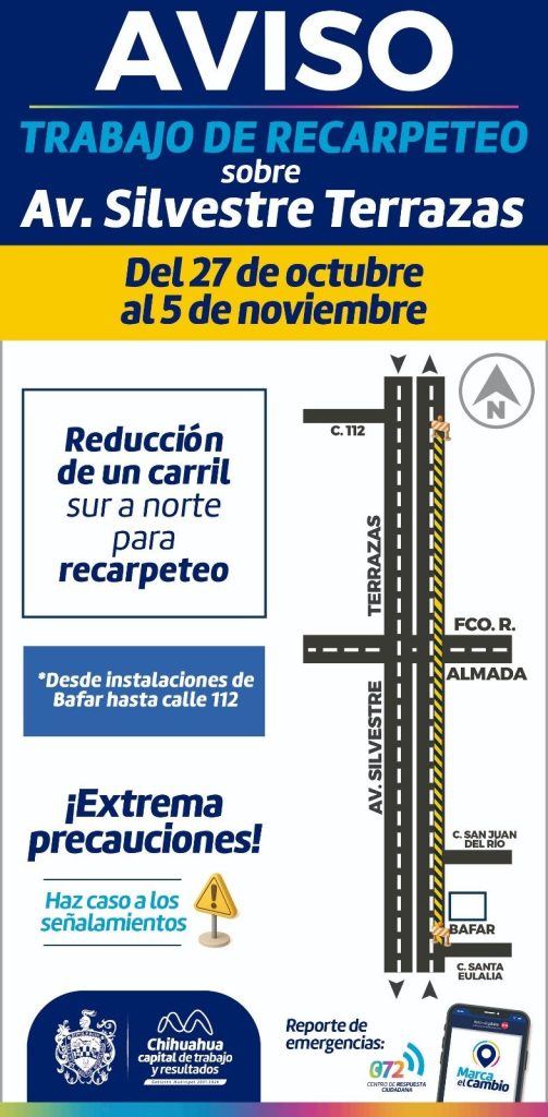 H. Ciudad de Chihuahua, Chih., a 24 de octubre del 2025.- El Gobierno Municipal, a través del Consejo de Urbanización Municipal (CUM), emite una alerta vial por los próximos trabajos de recarpeteo en el tramo de la carretera a Cuauhtémoc-Silvestre Terrazas que iniciarán desde la calle Santa Eulalia hasta la calle 112ª en sentido de sur a norte por lo que se exhorta a la ciudadanía a circular con precaución por la zona.