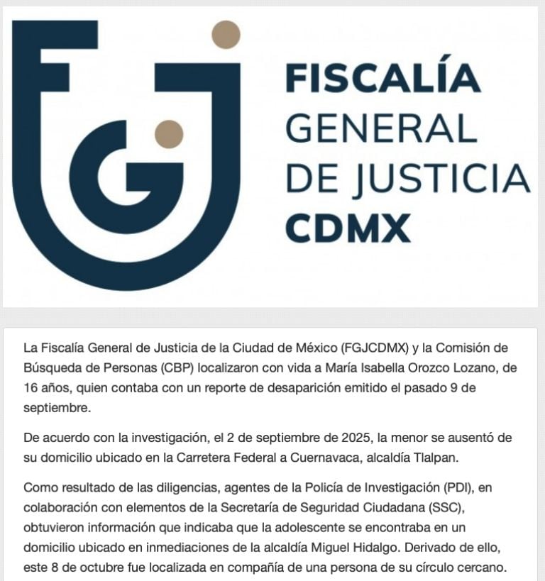 Aunque la Fiscalía capitalina informó que la adolescente fue localizada “mediante un operativo conjunto entre la Policía de Investigación (PDI) y la Secretaría de Seguridad Ciudadana (SSC)”, la madre sostiene que no se le ha permitido confirmar dicha versión ni acceder a pruebas que acrediten el hallazgo.