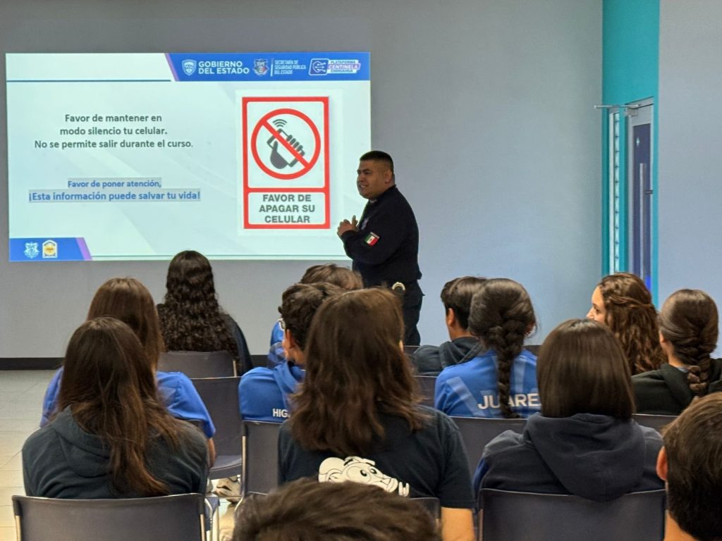 H. Cd. de Chihuahua.- La Secretaría de Seguridad Pública del Estado (SSPE) impartió una plática sobre el reglamento de Vialidad y Tránsito a 190 estudiantes de secundaria del Tecnológico de Monterrey, con el fin de fomentar la responsabilidad y cultura vial entre los jóvenes.