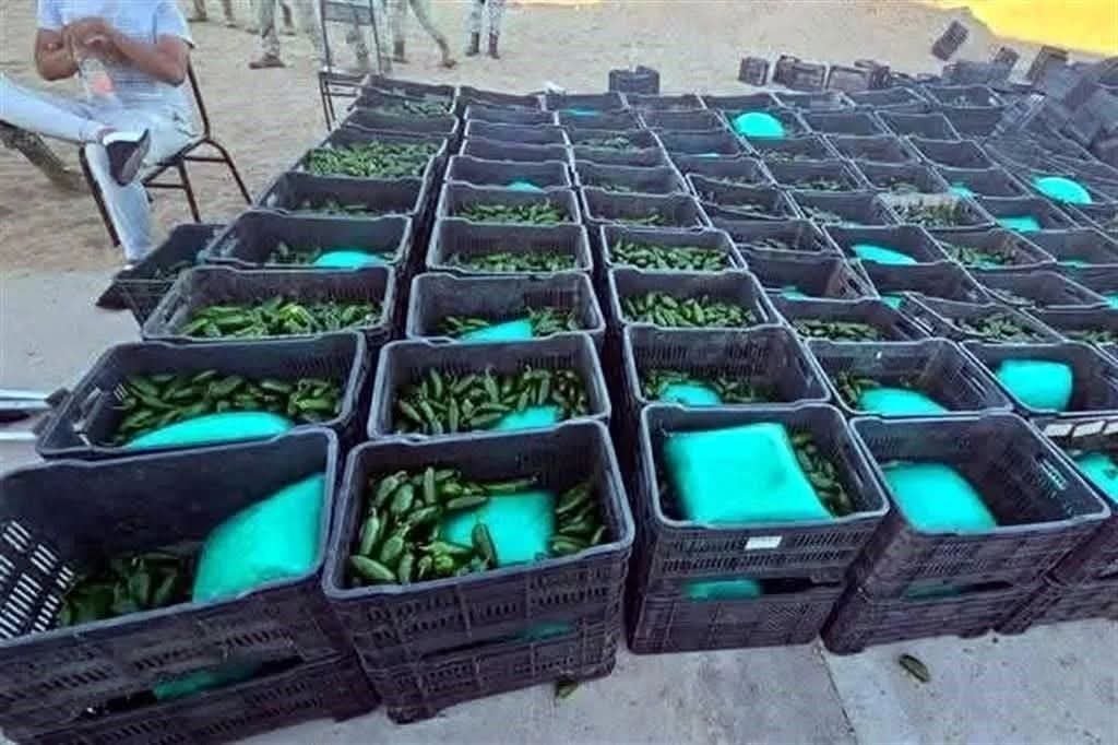 Durante la inspección del vehículo, los elementos localizaron varios paquetes de color verde camuflados entre las cajas que contenían productos del campo, aparentemente frutas y hortalizas, lo que pretendía dificultar la detección del narcótico.