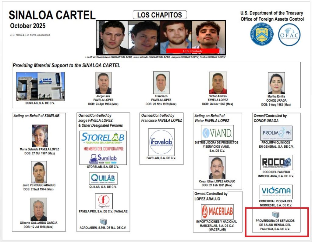 Además del grupo encabezado por Conde Uraga, la OFAC también sancionó a los hermanos Jorge Luis, Francisco, Víctor y María Gabriela Favela López, así como a otros empresarios vinculados a compañías químicas como Sumilab, Storelab y Quilab, todas con sede en Culiacán. Estas empresas ya habían sido señaladas desde 2023 por continuar suministrando precursores para la fabricación de fentanilo al Cártel de Sinaloa, a pesar de los intentos por ocultar su operación bajo nuevos nombres y estructuras.