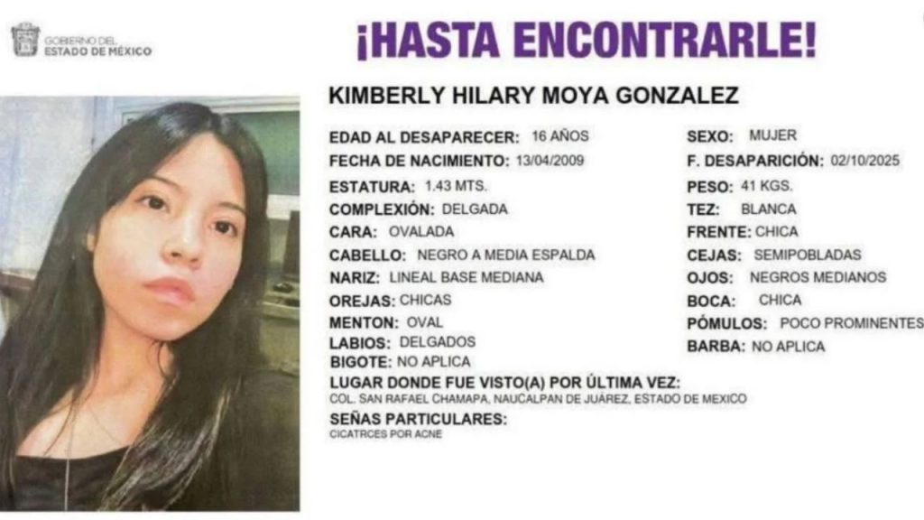 CIUDAD DE MÉXICO (apro).— La Fiscalía General de Justicia del Estado de México (FGJEM) mantiene abierta la investigación por la desaparición de Kimberly Hilary Moya González, una estudiante de 16 años del Colegio de Ciencias y Humanidades (CCH) Naucalpan de la Universidad Nacional Autónoma de México (UNAM), vista por última vez el 2 de octubre de 2025 en el municipio de Naucalpan de Juárez.