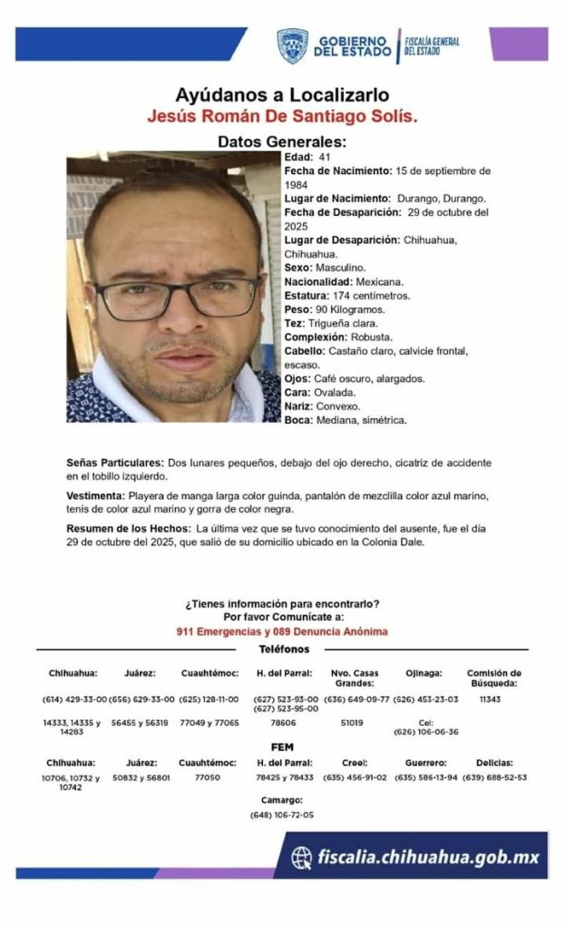 H. Cd de Chihuahua.- La Fiscalía General del Estado emitió una ficha de búsqueda para un hombre de 41 años que desapareció en la ciudad de Chihuahua el 29 de octubre de 2025.