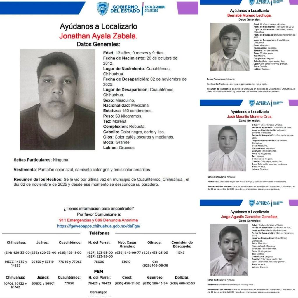 De acuerdo con la información oficial, los menores, todos de sexo masculino, fueron vistos por última vez en el municipio de Cuauhtémoc y desde entonces se desconoce su paradero.