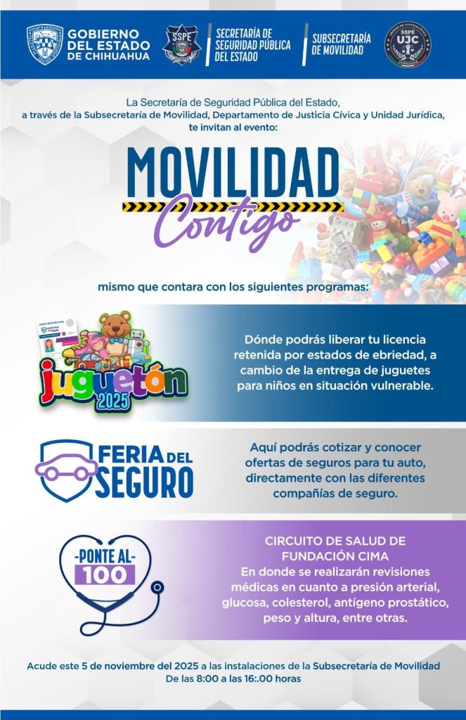 H. Cd. de Chihuahua.- La Secretaría de Seguridad Pública Estatal invitó a la ciudadanía al evento “Movilidad Segura”, que se realizará el 5 de noviembre en la Subsecretaría de Movilidad, con actividades enfocadas en la prevención y la cultura vial.