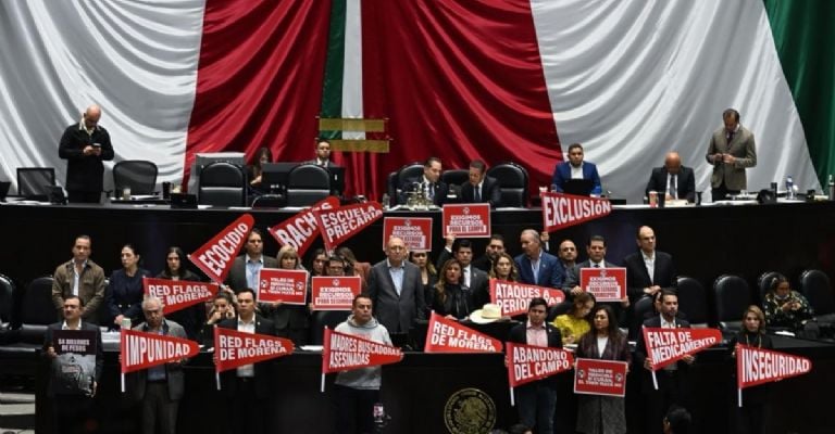Cuando se pensó que todo había terminado, desde la galería de invitados, legisladores tricolores, entre gritos y empujones, desplegaron una manta con una foto del diputado Arturo Ávila y la presidenta de Morena, Luisa María Alcalde, en una playa y con la leyenda: “Mientras esta pareja de cínicos se pasea en la playa, asesinan a los mexicanos”.