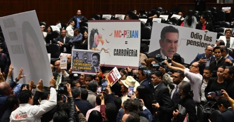 En ese momento la bancada del PRI y la de Morena se incorporaron de sus curules y se confrontaron entre acusaciones y con carteles: «Morena mató a Carlos Manzo», decía uno que tenía la imagen de Luisa María Alcalde, dirigente nacional del partido en el poder.