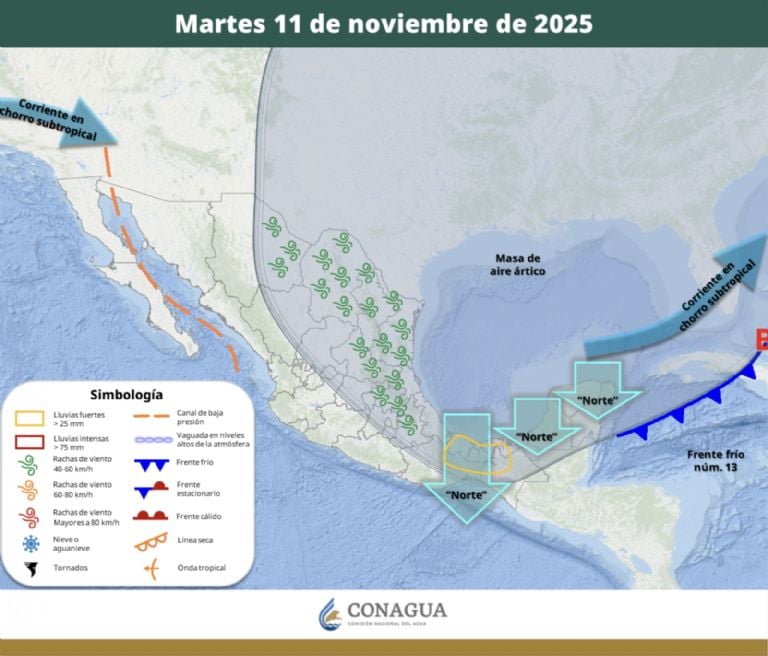 El organismo de la Comisión Nacional del Agua (Conagua) detalló en su pronóstico para el 11 de noviembre las entidades en las que la temperatura bajará hasta los -15 grados, así como las que serán afectadas por lluvias y vientos fuertes.