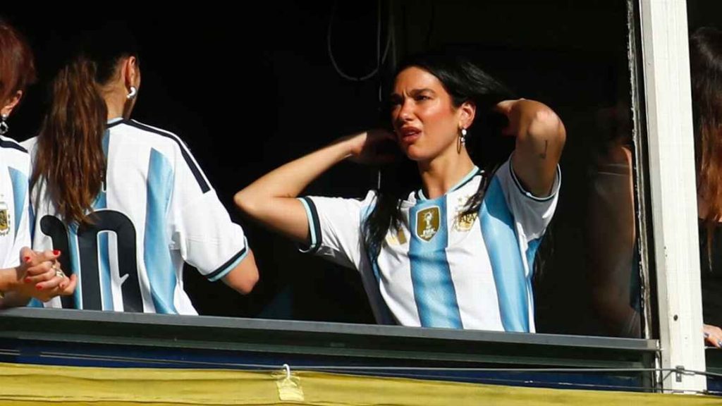 Dua Lipa apareció en uno de los palcos de La Bombonera luciendo un jersey de la selección de Argentina y se tomó un tiempo para saludar a algunos de los aficionados que se percataron de su presencia.