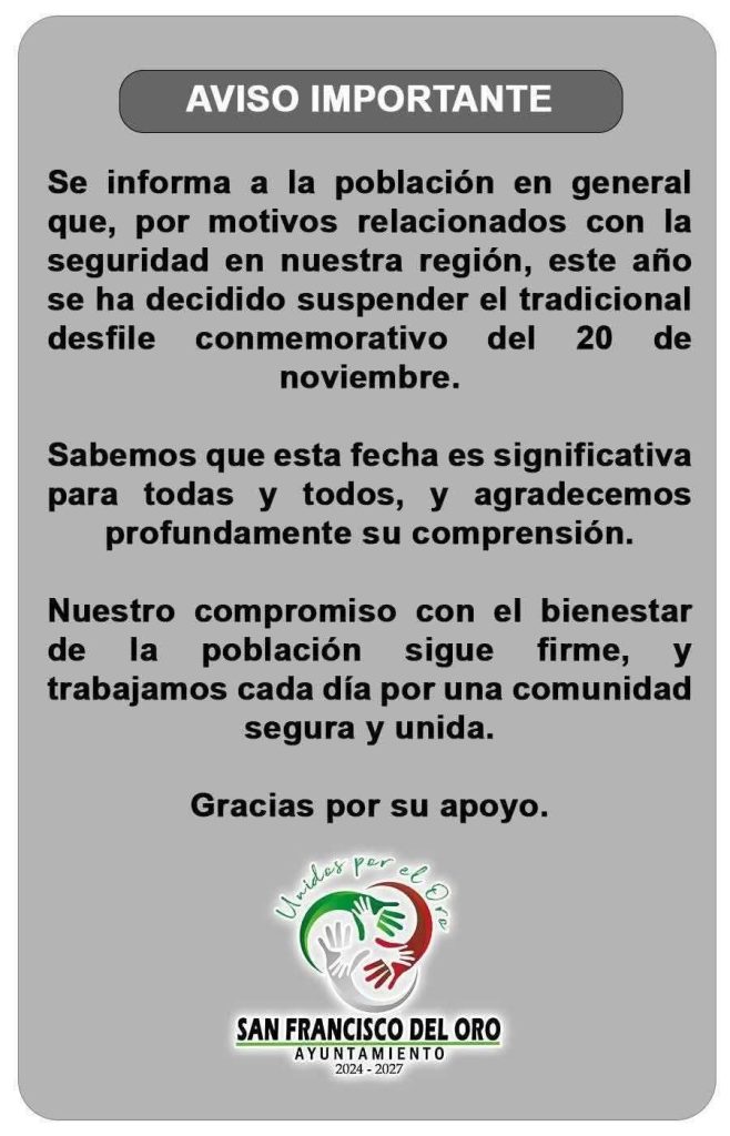 El Ayuntamiento de San Francisco del Oro informó que, por razones relacionadas con la seguridad en la región, este año se cancelará el tradicional desfile conmemorativo del 20 de Noviembre.