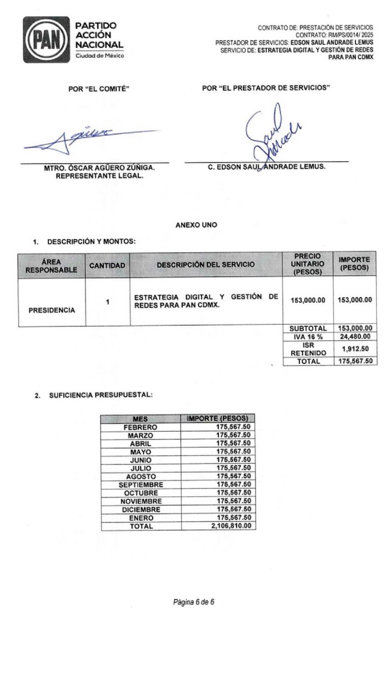 El contrato fue signado entre el comité regional de la Ciudad de México y el mencionado como persona física, a quien se le contrató la “Estrategia digital y gestión de redes sociales para PAN CDMX”.