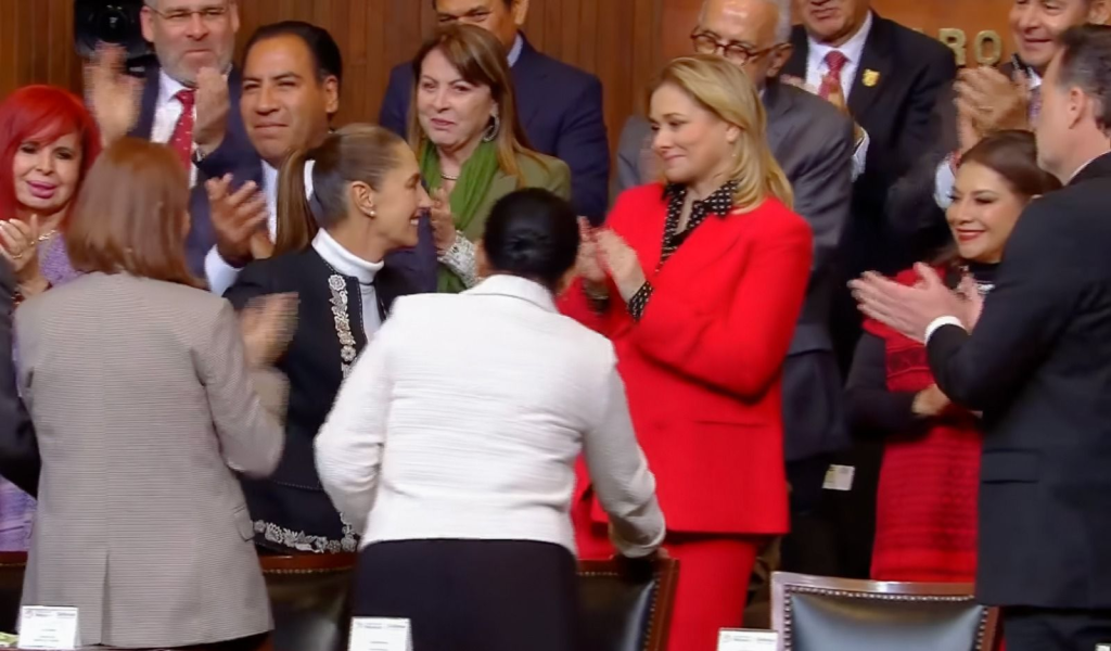 Junto con autoridades del Gobierno Federal, mandatarios estatales y representantes de instituciones legislativas y judiciales del país, la mandataria se dio cita en el Teatro de la República para estar presente en el acto cívico.