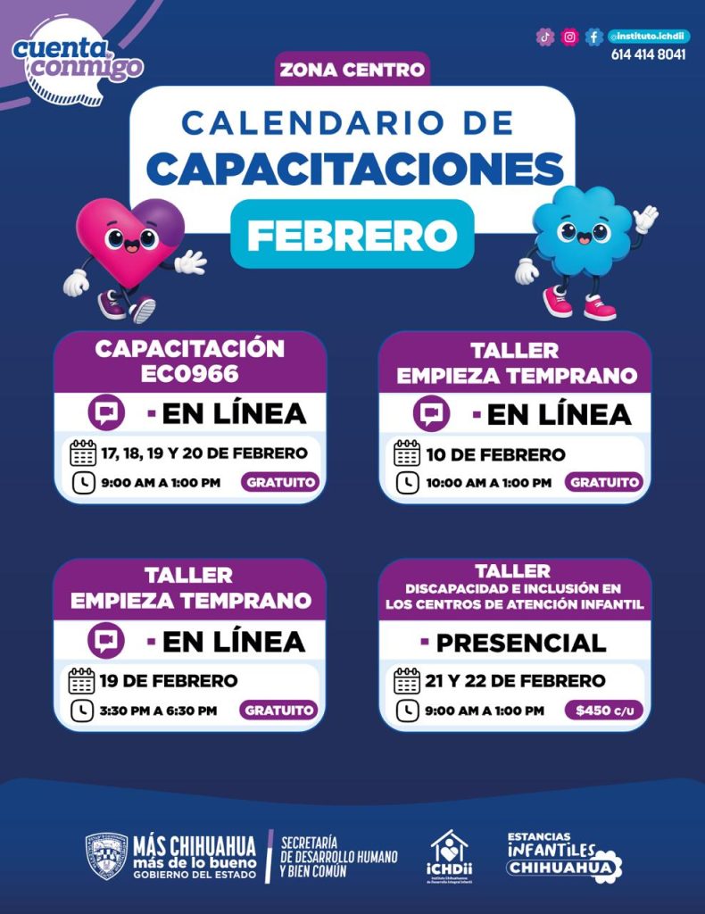 El Gobierno del Estado, a través del Instituto Chihuahuense de Desarrollo Integral Infantil (ICHDII), presentó el calendario de capacitaciones dirigido a las estancias infantiles durante el mes de febrero.