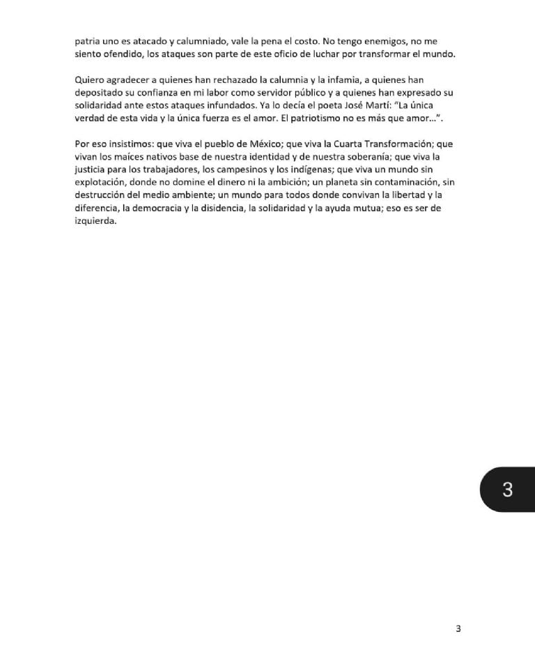 “Quien acusa tiene que probar, quien reproduce la mentira se hace cómplice de ella. Los verdaderos medios libres dan derecho de réplica y no organizan linchamientos mediáticos. Este libelo es un ataque disfrazado en contra del movimiento de la Cuarta Transformación, del ex presidente Andrés Manuel López Obrador y de la presidenta Claudia Sheinbaum Pardo”.