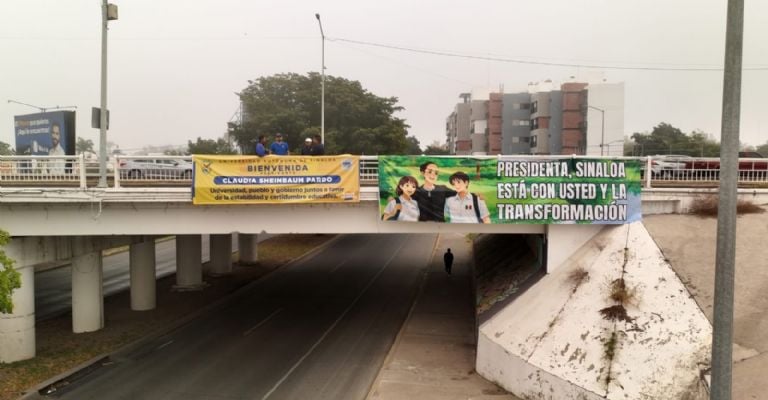 En Culiacán, en al menos dos puentes sobre el nuevo Malecón, trabajadores de la Universidad Autónoma de Sinaloa (UAS) colocaron mantas de apoyo a la presidenta, en un despliegue que incluyó también acarreo de trabajadores universitarios.