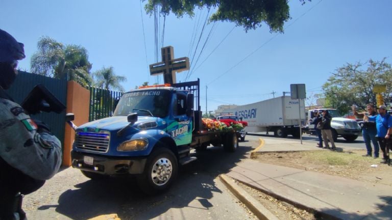 La comitiva estuvo integrada por dos carrozas: en la blanca fue trasladado el féretro y en la dorada un arreglo floral monumental con la figura de un gallo, elaborado con flores rojas y plumas. Inicialmente, el adorno portaba las siglas del Cártel Jalisco Nueva Generación (CJNG) cuando estuvo en la funeraria.