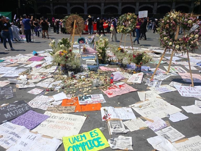 Poco a poco ingresó el contingente de miles de mujeres que, este 8 de marzo, se empoderaron y tomaron los espacios públicos. En segundos, la Plaza de Armas frente al Palacio de Gobierno estaba llena. Las vallas de acero gigante, que simbolizaban qué tan lejos se encuentra hoy la gobernadora Margarita González Saravia de las mujeres morelenses, quedaron rodeadas por las manifestantes. En el centro permanece un altar, una ofrenda floral con carteles en memoria de Kimberly.
