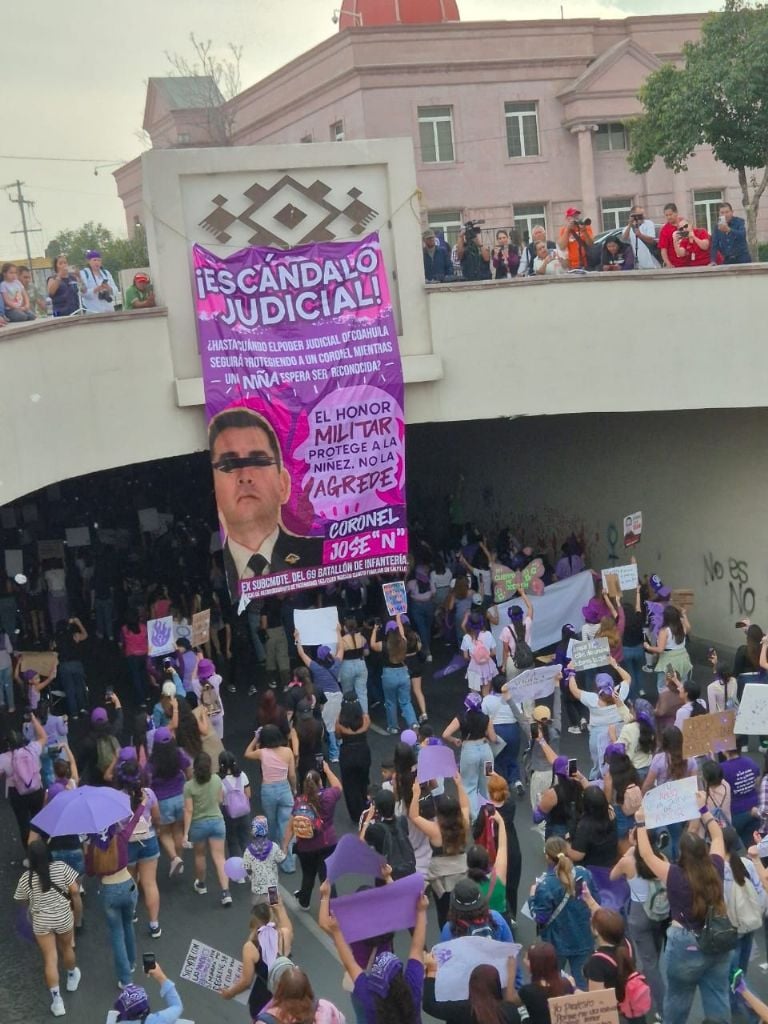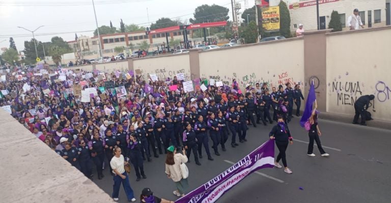 SALTILLO, Coah., (apro) .- La marcha del 8 de marzo en Saltillo terminó fracturada. Frente a una lona que advertía “Hasta aquí llega la marcha 8M 2026 Saltillo” y un bloque de mujeres policías, el contingente transincluyente, integrado por víctimas de violencia vicaria, activistas proaborto y personas trans, así como quienes apoyan a esta población, fue impedido para ingresar al resto del contingente lo que desató empujones, reclamos y acusaciones de exclusión.