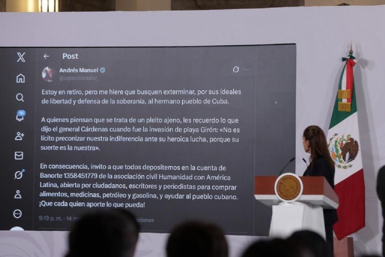La jefa del Ejecutivo Mexicano promovió que “es este llamado que hace él y hacen muchas personalidades. Es un llamado solidario al pueblo de Cuba, porque está sufriendo el pueblo de Cuba y es un sufrimiento que no tiene que ver con ellos, es un sufrimiento que tiene que ver con un aislamiento que está desde hace décadas con un bloqueo comercial y recientemente con un bloqueo de combustibles”.