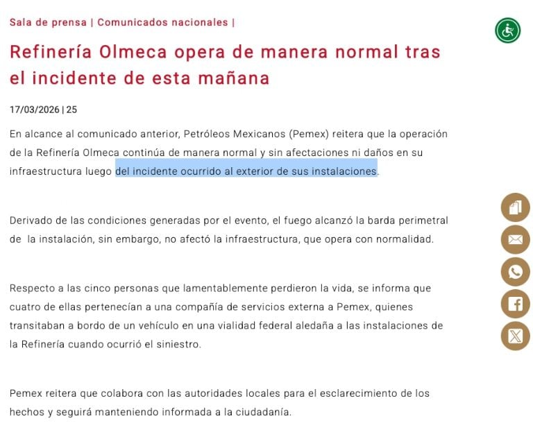La versión contradice lo informado por Pemex, que aseguró en un comunicado que el siniestro ocurrió en una vialidad aledaña y que no hubo daños en la infraestructura de la refinería.