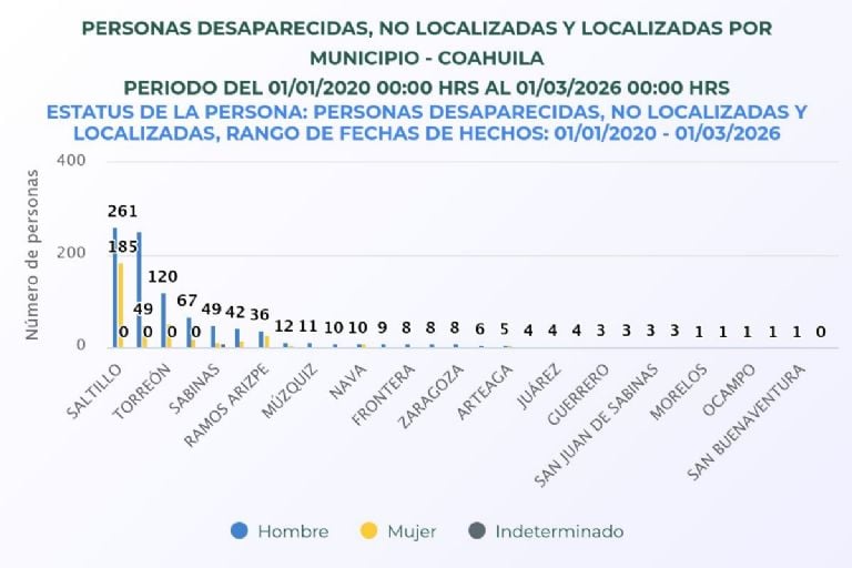 Desde el 1 de enero del 2020 al 3 de marzo del 2026, en el estado de Coahuila se tiene el reporte de 413 mujeres desaparecidas contra 944 hombres, de acuerdo con el Registro Nacional de Personas Desaparecidas, No Localizadas y Localizadas (RNPDNO).