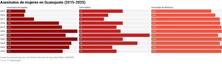 Asesinatos de mujeres en Guanajuato, según datos del SESNSP.